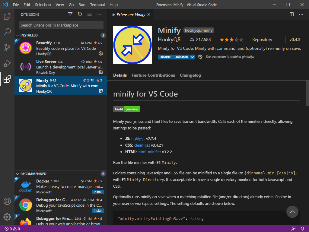 압축하고 싶은 Javascript 파일을 선택후 단축키(Ctrl+Alt+M) 누르면 해당파일명.min.js로 자동생성된다.